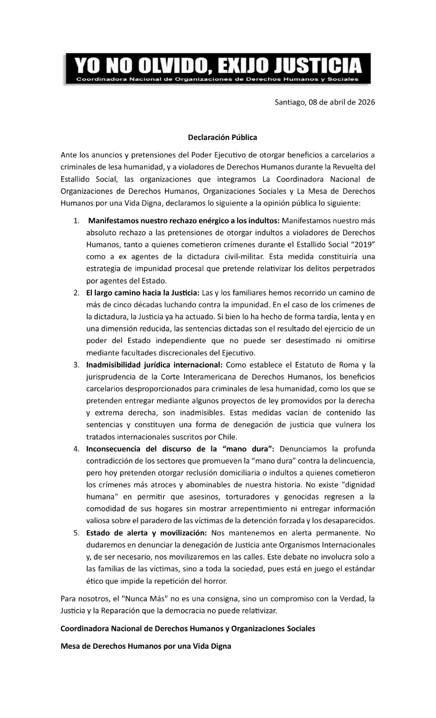 El texto subraya que las sentencias judiciales son resultado de un poder estatal independiente que no puede ser desestimado mediante facultades discrecionales del Ejecutivo. Esta postura se alinea con la jurisprudencia internacional que rechaza la impunidad para violaciones graves de derechos humanos. Patricio Lama Santibáñez, secretario de Solidaridad y Conflictos de la ANEF, representó al sindicato en la manifestación.